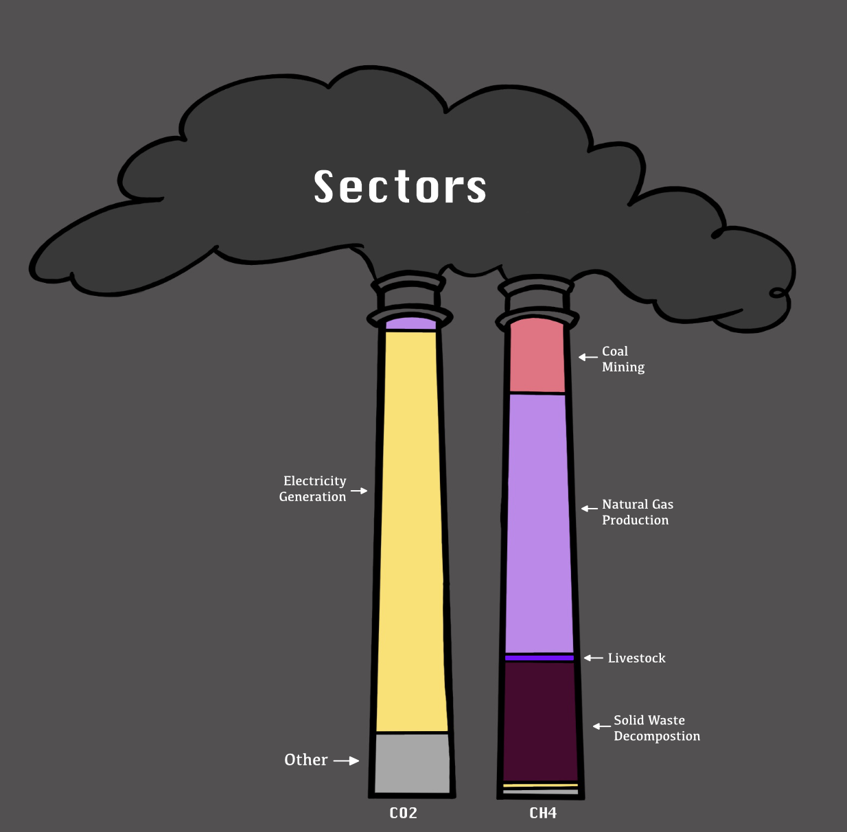 subtitle = "The oil and natural gas sector emits the most methane,\nwhereas Electricity Generation emits the most carbon dioxide.",